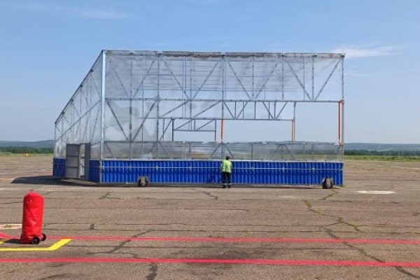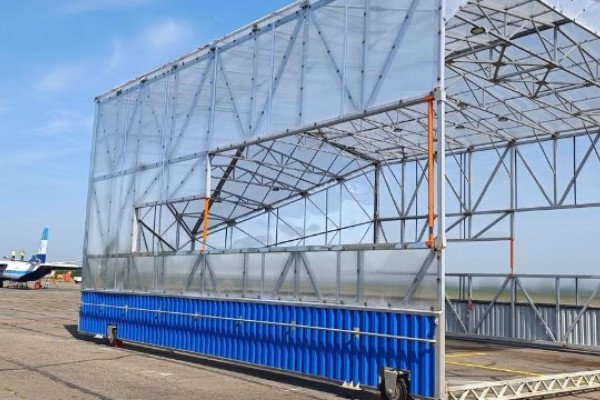 Покрытие поликарбонат.На месте стоянки мобильный ангар крепится к покрытию стопорными якорями через цепи.Конструкция в реальных условиях выдержала порывы ветра 35 м/с.